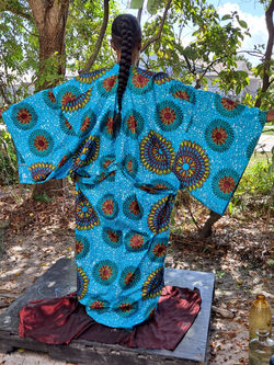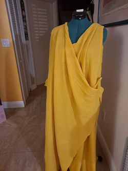 tie dye cotton drape with faux pockets. Form fitting front tie. Great for summer business and cocktail events.